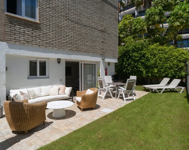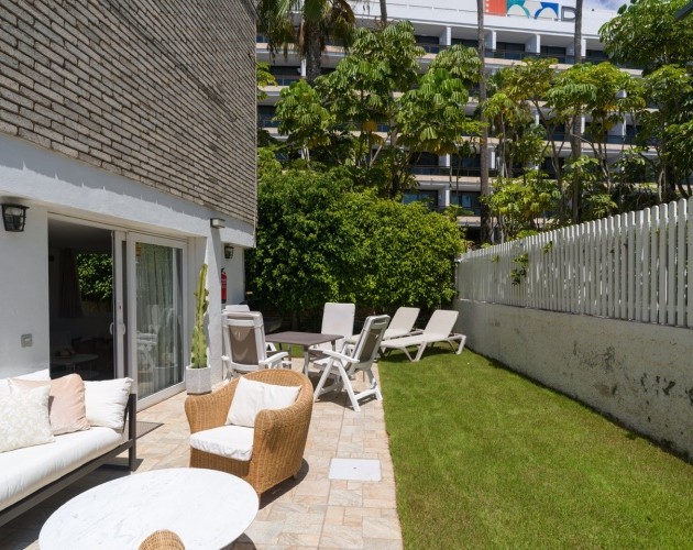 Charming apartment with garden and optional garage. Located on the beach of Maspalomas a few meters from the sea. Modern and actual decoration. Well equipped: living room with kitchenette, dishwasher, sofa bed (optional), large bathroom with washing machine area, TV with Chromecast and high speed WIFI. Large garden with outdoor table and umbrella, to enjoy outdoor lunches. Garden equipped with two sun loungers and solar shower.